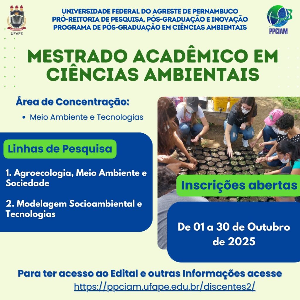 A Coordenação do Programa de Pós-Graduação em Ciências Ambientais da UFAPE (PPCIAM) informa que de 01 a 30 de outubro...