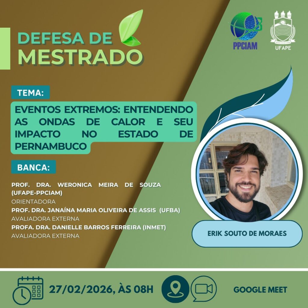 O PPCIAM convida para a defesa pública de dissertação de mestrado do discente Erik Souto de Moraes TÍTULO: Eventos Extremos:...