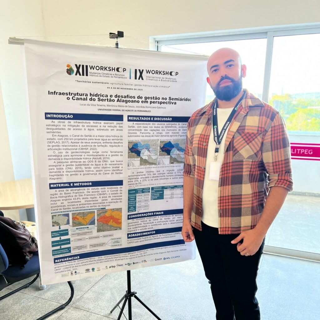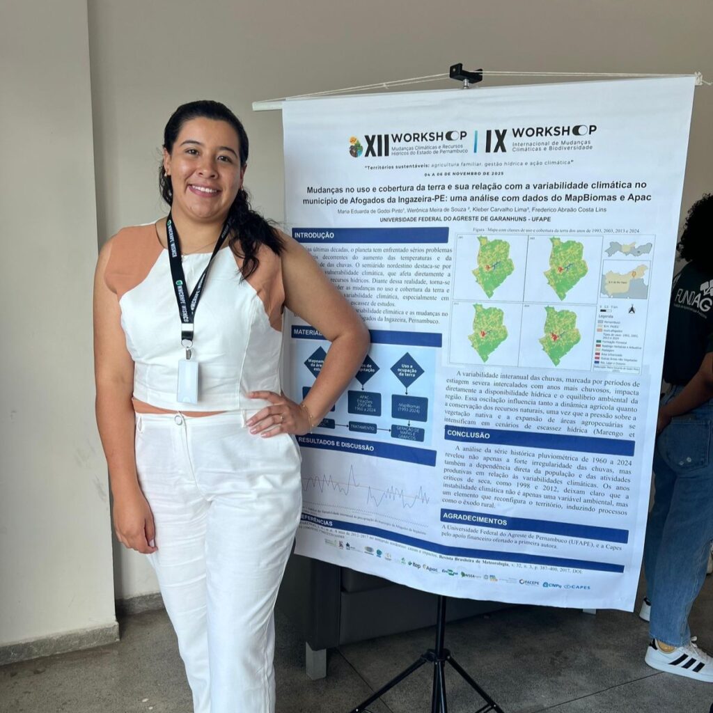 A presença do PPCIAM foi marcada pela atuação conjunta dos professores Josiclêda Galvíncio, Werônica Meira, Horasa Andrade e Luciano Andrade e dos discentes que contribuíram ativamente para as discussões, mesas-redondas, apresentações e momentos de integração acadêmica. Este ano, o Programa destacou-se pela apresentação de nove trabalhos científicos desenvolvidos pelos seus alunos Eduarda Godoi, Isadora Tavares, Lucas Teixeira, Erik Moraes, Cristina Calheiros, Carla Renata, Robson Alves e Aymê Melo reafirmando o compromisso da UFAPE com pesquisas de excelência, relevantes para o entendimento das mudanças climáticas no Semiárido e para a busca de soluções sustentáveis.